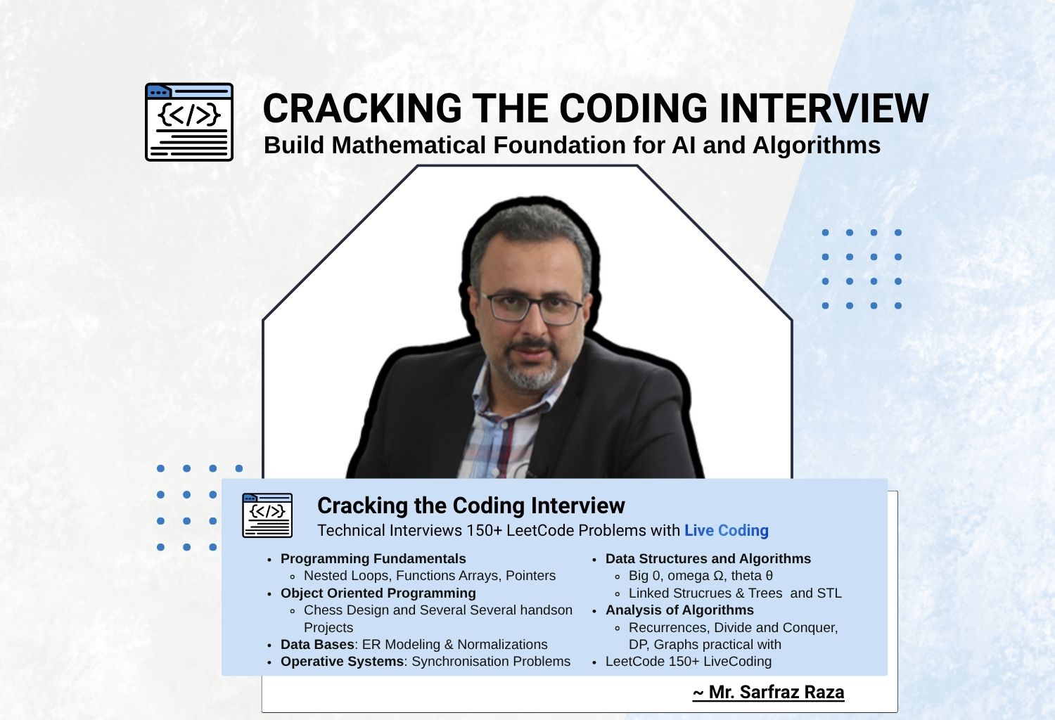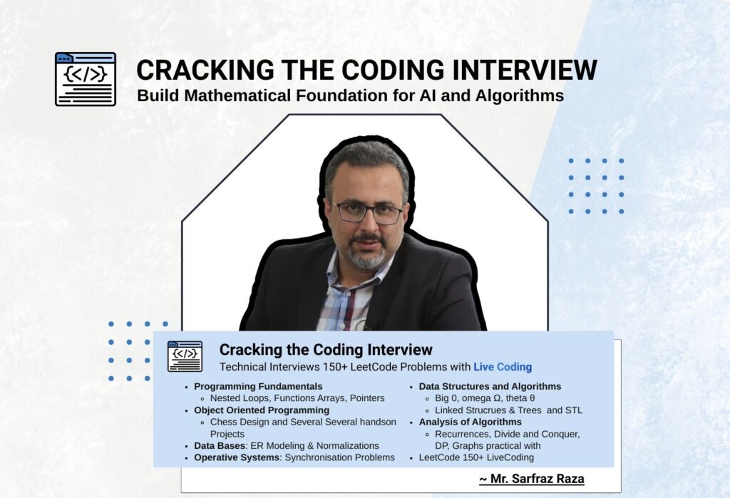 This program offers three specialized tracks that take students from fundamentals to industry-ready expertise. The Mathematical Foundations for AI and CS course builds core math skills in discrete math, linear algebra, and calculus to explain how AI systems work. The 6-Month Cracking The Coding Interview Course focuses on data structures, algorithms, and system design using C++ and Python. The Advanced AI and LLM Engineering track covers neural networks, transformers, and LLM deployment. Each program follows a project-first approach with real systems like chess engines and generative models. We also emphasize LeetCode-style practice and mock interview preparation to build strong problem-solving and hiring readiness.